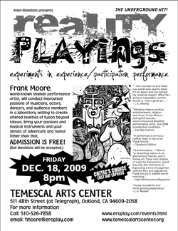 The performance changed gears and Frank had Michael undress us and adorn us with jewelry. Then we started to dance. The music grew and jived. The feeling was fun and free. We melted into slow erotic movements together with the music. Frank jammed along with the band. Then he had Jhon sing a couple of songs that were amazing. He came willing to play. We rubbed into each other and felt like the whole room was one. The Christmas song that was played was really great. Little drummer boy distorting and morphing into scratchy groovy vibrations. The guy on the roto toms was great. We had our new Christmas special!