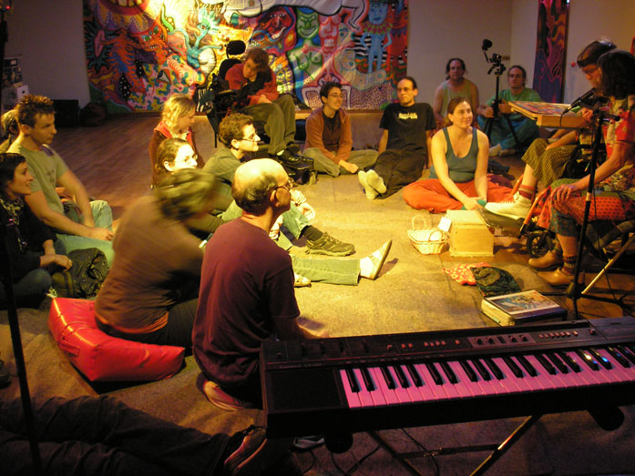 6/28/2009 Last night was a great birthday present. At the end of the performance, I kept saying it was the “best “ performance we have done… Which is really a meaningless statement. What is “the best”? But it was equal to the UCB performances and the one in Brooklyn. In some performances you have to squeeze possibilities out of rocks! Other performances are a flood of possibilities and potential paths that you need to weave together the best you can. This was that kind. Some of the potentials slipped through without being fully developed… Such as the woman who did non linear non verbal art therapy. But it was a feast of willing people hungry for going deep within experimental play together. Of course the night started with an uptight woman. This time she was in a wheelchair. Her attendant brought her because she said she wanted to participate. But it was quickly revealed that she wanted to keep on being a crip. But the space quickly filled up with people who wanted to play and to sing with her. It became obvious that she did not want to drop her mask! And there was the future minister made dense by dogma. But the rest were ready to jam and dance and play, ready to put on almost nude costumes. Even the conversation was aroused making love. Ava Bird, the poet, read some of her poems about pussies, backed up musically by Tomek and Kene-J, while people undressed one another and put on the costumes. Then the musicians created a sexy musical ecstasy in which people danced into a tansexual trance, quivering flesh of pleasure of deep contact. Carol Swan began to vocalize non-verbal eerie wails, destroying time. Ava did an immensely rich full amazing reading of the first twenty pages of my novel, THE INNER MAZE, understanding everything, giving context to the ever changing dance. Everything meshed together! To put it simply, everything kept getting deeper, showing what is possible. And it was so much fun!