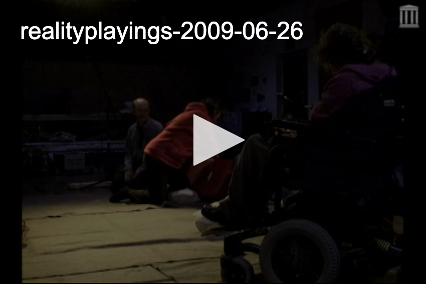The very beginning of the performance was Frank talking to Chloe and Rae ... Linda said later that it was perhaps the most intense part of the performance ... Chloe obviously was very capable, could talk, sing, etc., and there is Frank, in a wheelchair too, and can't talk! They had no idea that it was HIS performance before they showed up! Chloe just clammed up, and Rae spoke for her ... Linda said later that they imagined it was going to plant some seeds in their relationship ... Rae knew that Chloe could have participated much more, but she just closed down ... Rae told Frank that Chloe is a whiz with song lyrics and loves listening to music and singing along ... so Frank said, "Let's test that!" Linda asked Alexi to come up with a song, and of course on the spot, his mind went blank! All he could come up with was "Help!", since she had mentioned "Beatles" ... Pretty soon, the whole crowd, of maybe 18 people, plus us, were singing "Help, I need somebody ..." But Chloe didn't make a peep ... They stayed a while though ... and we saw Chloe at times with a huge smile on her face, and she was really fascinated when Unru-lee and Nell undressed each other and put on costumes ... but Chloe and Rae left just as the dancing was starting up ... It is amazing how quickly and directly Frank's work calls people to their core, gives complete freedom and total responsibility, and then to see what people do with that ... We were all saying later that Chloe hid behind "crip", rather than following Frank's lead ... even as he spelled it out for her ... how he could sing, and could fake not knowing the lyrics, or the tune!